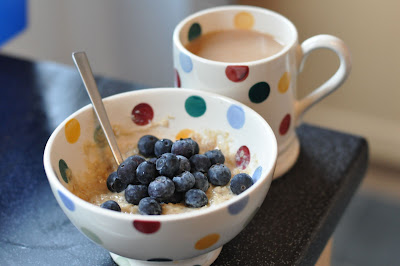 When we got home I had my standard post run breakfast; porridge with blueberries, cup of tea and a large glass of water. So warming and filling- yum.